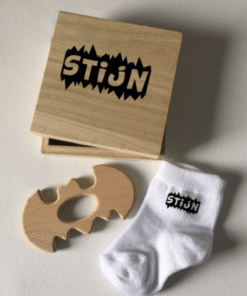 - Kraamkado met naam: doosje, sokjes en bijtring vleermuis