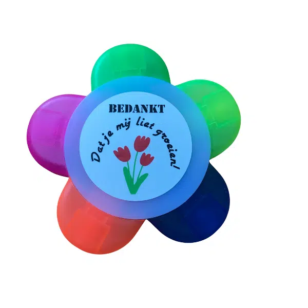 Set van 5 markeerstiften voor jouw juf of verzorger in een witte houder in de vorm van een kleurrijke bloem.