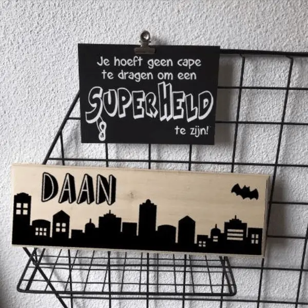 Deze stoere Batman naamhanger voor de kinderkamer hang je aan het bed of aan de muur. De hanger met naam is gemaakt van duurzaam hout. Aan de achterkant zit een gaatje zodat je het houten naambordje met een spijker/schroef kunt ophangen.