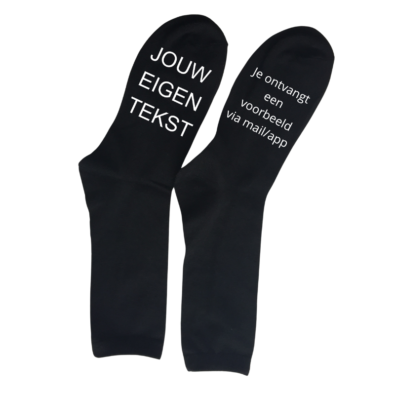 Je kunt kiezen waar de tekst op de sokken komt: onder de voet of op de zijkant. Een korte tekst van een paar woorden werkt meestal het mooist en zorgt voor een duidelijk en stijlvol resultaat. Bij bedrukking op de onderkant wordt gebruikgemaakt van flockdruk, een zachte en duurzame druktechniek. Kies je voor de zijkant, dan wordt de tekst met flexdruk aangebracht.