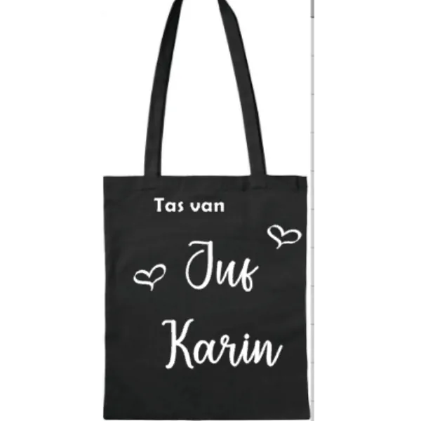 Een mooi tasje voor de juf met haar naam! Het is een schattig tasje met lange hengsels. Juf kan er kleine dingen in meedragen of in haar grote tas stoppen om kleine boodschap in mee te nemen.