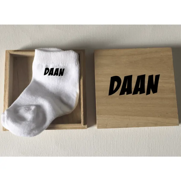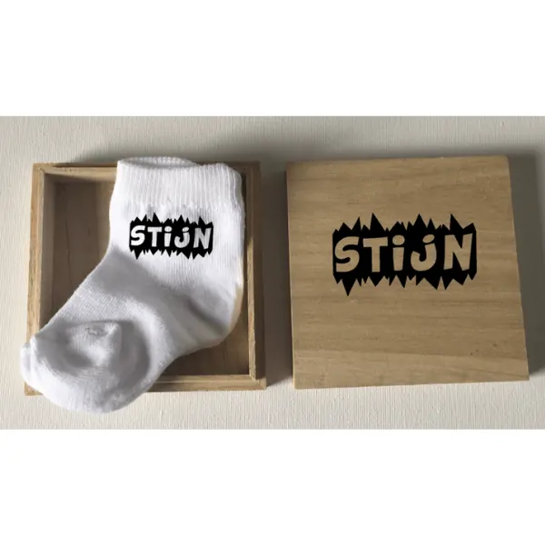 Heb je binnenkort een kraamfeest of is er een collega bevallen op je werk? Gefeliciteerd! Met mijn geboorte pakket babysokjes met naam geef jij een blijvende herinnering kado aan de kersverse ouders. Op de sokjes en de houten box bedruk ik de naam van de pasgeboren baby. Het houten doosje kan later gebruikt worden om blijvende en speciale herinneringen in te bewaren,. Denk hierbij aan een haarlok, echo of een eerste tandje.