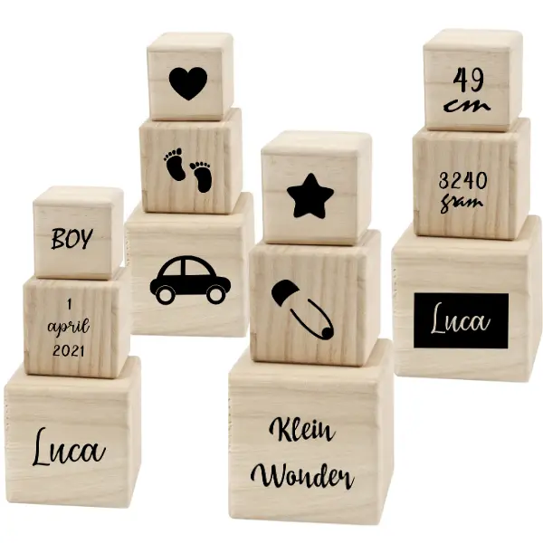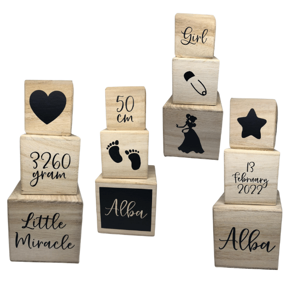 De gepersonaliseerde houten geboortetoren van blokken in 3 verschillende maten. De houten blokken toren is bestickerd met geboortedatum, gewicht, lengte en de naam maakt de babykamer compleet! Je zet deze in de kast of op een plank ter decoratie.