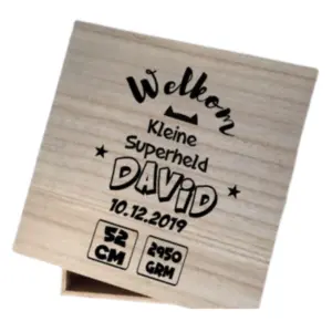 Deze mooie houten box is een prachtig kraam cadeau voor een pasgeboren kleine superheld. Je vult het kraam cadeau met de romper, slab en het mutsje. Ook hebben we een bijpassende spaarpot bijgevoegd.