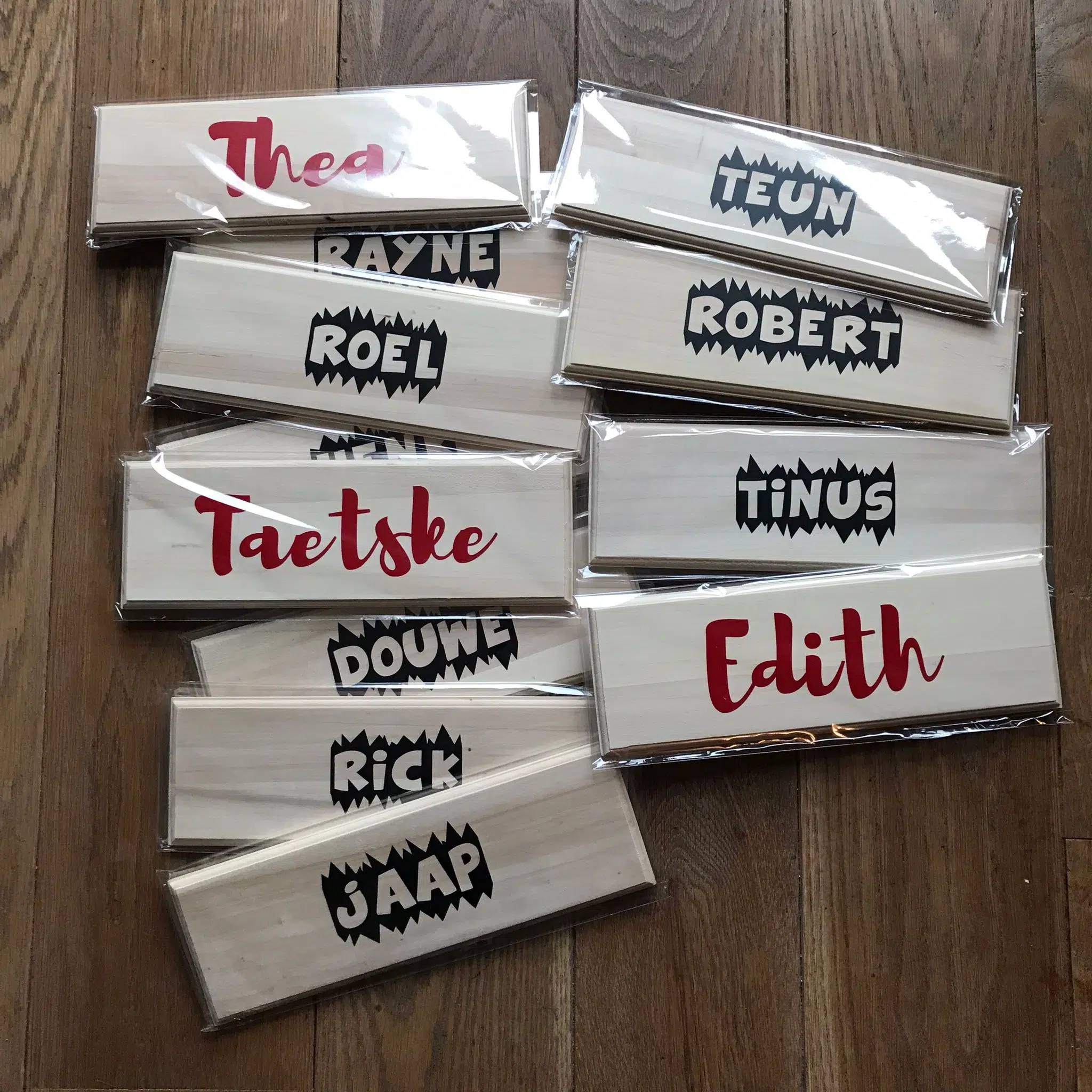 De bordjes zijn gemaakt van onbewerkt hout en verkrijgbaar in een ovaal of rechthoek. Je kunt het neerzetten of eenvoudig plakken met dubbelzijdige tape .