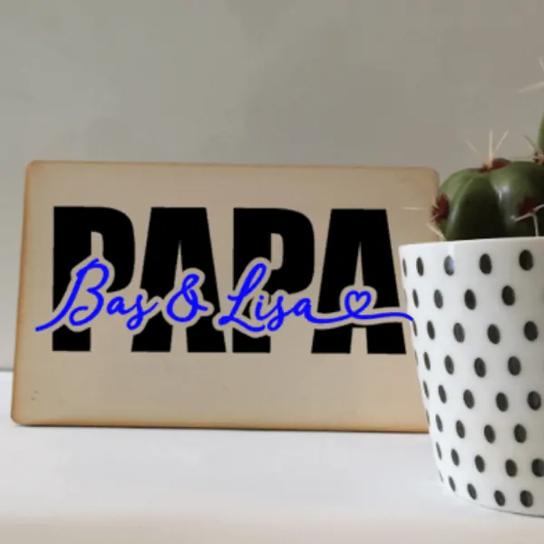Deze houten kaart is een uniek kadootje voor papa, hij kan de kaart bewaren. De bedrukking is 2 kleurig en de namen van de kinderen staan in het woord Papa.