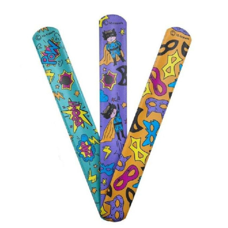Deze gave klaparmband met afbeeldingen van superhelden maskers en uitspraken! is geweldig voor de feestvierders op het superheldenfeest. De superheldjen verlaten het kinderfeest helemaal in stijl met deze leuke automatische klaparmband.