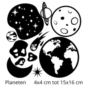 - Formaat: diverse formaten melkweg: 29 x 29 cm en planeten van 4 cm tot 15 cm breed,sterren 2,5×2,5 cm en 5×5 cm