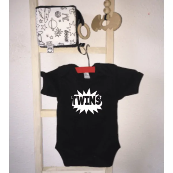 Deze romper is lekker stoer! De opdruk van Twins in een stoere comic ster.