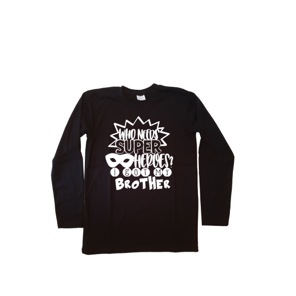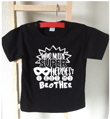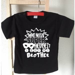 Met een knipoog naar de grote Superheld, is dit shirt met tekst ” who needs a superhero i got my brother” natuurlijk supertof!